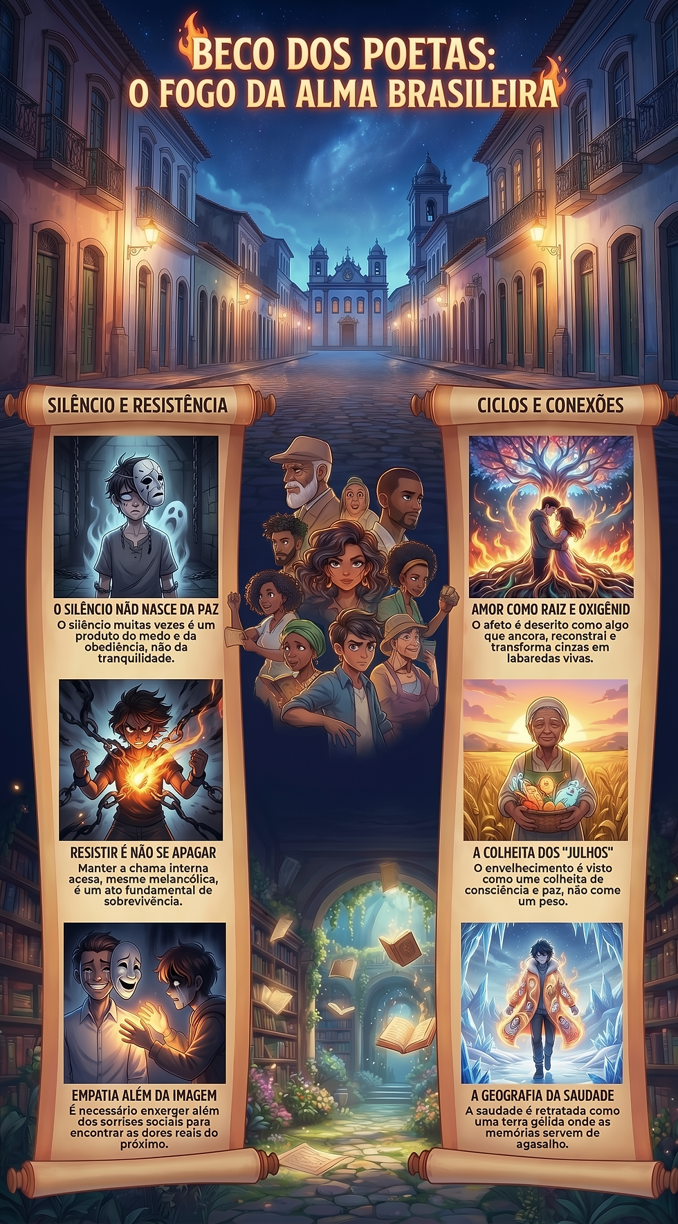 Por isso, se ainda houver fogo, mantenha. Não o fogo de lareira bonita para a foto. Mas o outro — o que chia, o que treme, o que arde mesmo molhado. O que não quer aparecer, só continuar. Não apague. Porque a noite é longa, e há quem conte com o seu cansaço para dizer que ela venceu. Ainda há quem cante baixinho no escuro. Ainda há fósforos escondidos entre dedos trêmulos. Ainda há quem desafie o silêncio só para lembrar que está vivo.